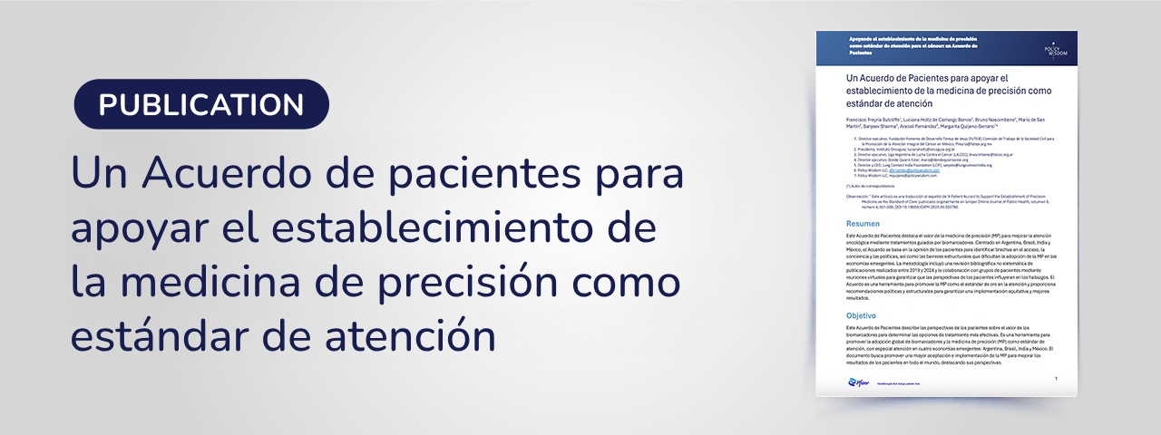 Este Acuerdo del Paciente busca posicionar a la MP como el estándar de oro en la atención del cáncer. Describe qué es la MP, qué son los biomarcadores y cómo se aplican al cáncer; analiza su valor y la situación actual en las economías emergentes; y revisa políticas globales y regionales. A partir de las ideas clave de representantes de pacientes, identifica vacíos, barreras y desafíos para su implementación, y concluye con recomendaciones impulsadas por los propios pacientes.