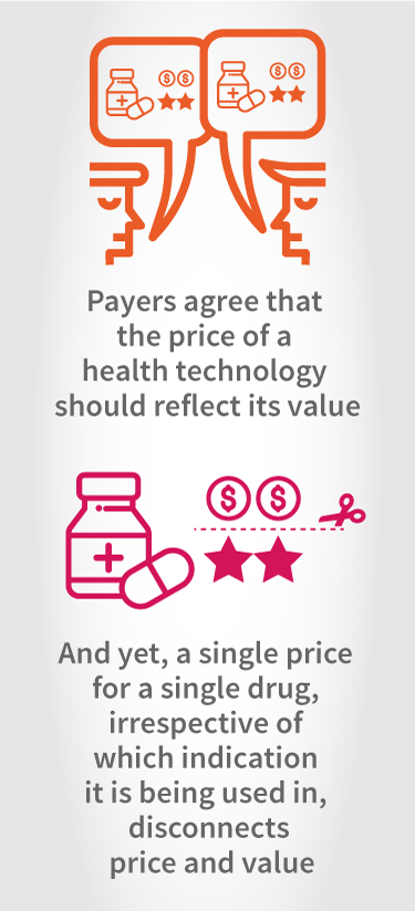 Many drugs have multiple indications that derive different patient benefits across each indication. There is also a widely-held belief that the price of a medicine should be linked in some way to the value it generates for patients and health systems (known as value-based pricing). It makes sense then, that the same drug might represent different degrees of value across different indications, and that the price a payer is willing to pay to use that drug in different indications would vary accordingly.